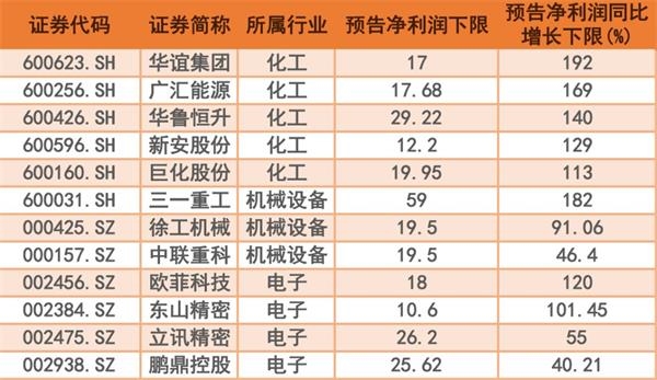 其中华鲁恒生净利预计29亿,巨化股份预计19亿,广汇能源预计17亿,华谊集团预计17亿,新安股份预计12亿。