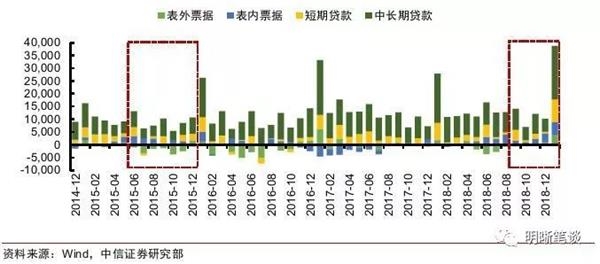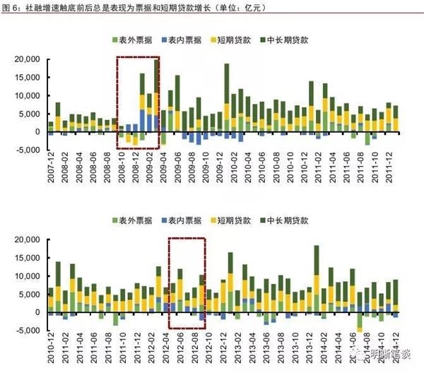 回到信贷和社融数据的结构,票据和短期贷款的增长背后暗示着监管和银行放贷意愿回升,金融数据可能面临企稳过程。从结构上看,1月社融和信贷超预期很大部分是票据和短期贷款的大幅增长,而新增中长期贷款规模较低成为对短期内金融数据悲观的主要理由。但实际上,货币政策传导和信用扩张是一个过程而非存在明确的分界点,而银行放贷意愿、风险偏好的修复的过程也会遵循从短期到长期的过程。回顾社融增速触底企稳的几个代表性时间点,2008年10月、2012年5月、2015年6月,都经历了票据融资增长、短期贷款增长的过程。因而,不能因为票据和短期贷款占比较大、中长期贷款增长较少而忽视信贷市场的趋势变化。