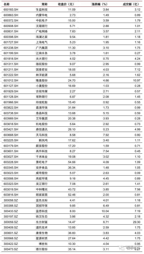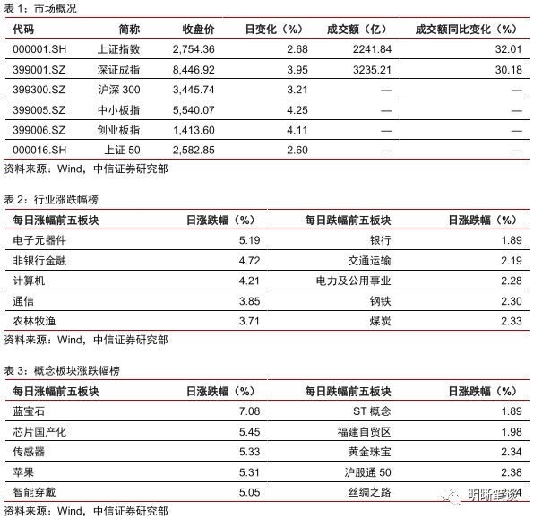 2019年2月18日,银行间回购加权利率全部下行,隔夜、7天、14天、21天和1个月分别变动了11.49bps、4.23bps、10.91bps、13.74bps和-127.62bps至1.71%、2.22%、2.42%、2.57%。国债到期收益率全面下行,1年、3年、5年、10年分别变动1.12bps、1.99bps、2.96bps和3.00bps至2.32%、2.67%、2.91%和3.11%。上证综指收涨2.68%至2,754.36,收涨3.95%至8,446.92,收跌涨4.11%至1,413.60。