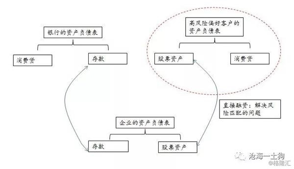 通过上面的流程图,我们可以直观地理解直接融资体系的作用以及旧体系的缺陷。在一个间接融资为主的体系里,如果没有高风险偏好的客户充当媒介,商业银行是无法向企业发放贷款的,因为风险偏好不匹配。但是,如果存在一个直接融资市场,高风险偏好客户可以凭借自己优质的资产负债表向银行融资,再把资金借给企业。