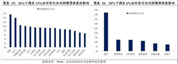 从不同行业情况来看,标准档16%下降至13%后,采掘、化工、机械等行业业绩厚增程度较高(16%-10%);优惠档10%下调至6%后,通信业绩厚增程度(43%)显著高于其他行业。