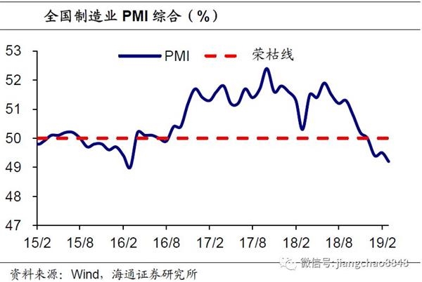 经济:PMI再创新低。19年2月全国制造业PMI为49.2%,较1月回落0.3个百分点,仍处荣枯线下,并创下16年3月以来新低,指向制造业景气仍在转弱,主要分项指标中,需求、价格回升,生产回落,库存去化。1-2月38城地产销量增速大幅回落至1.1%,而乘用车销售依然负增,1月及2月前三周乘联会乘用车零售销量增速降幅收窄至-13%,而批发销量增速-22%,仍在下行探底。1月重点钢企粗钢产量增速回落至2.7%,1-2月发电耗煤合计同比跌幅扩大至10.2%,工业生产恢复偏慢。