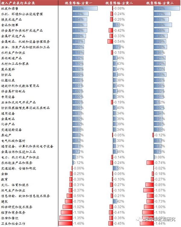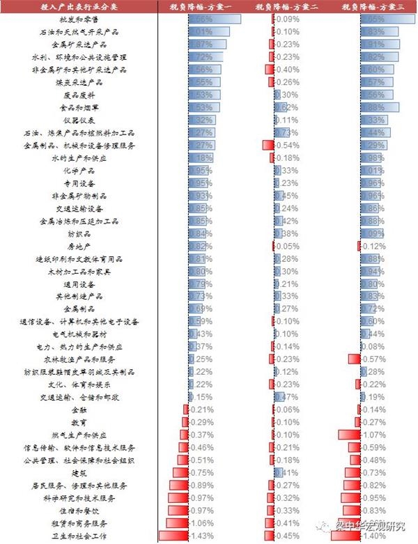 方案二情形下,仅考虑制造业税率从16%调至13%,建筑和交运行业从10%调整至9%,实施减税后各行业减税效果的分化相对没有那么明显,所涉及的制造业、建筑和交运行业税负普遍下降;而其他行业如生产、生活性服务业、采矿业则相对受损。该方案下,受损的行业主要是未实施减税的行业,即原本为6%税率的服务类行业、不考虑调降继续维持16%、10%的批发零售业、采矿业和农林牧渔业。