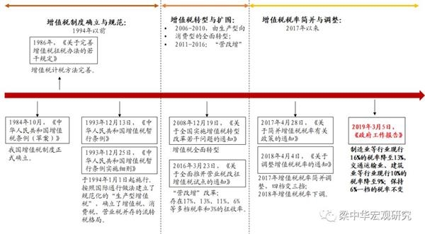 从整个历史趋势来看,我国增值税改革自2017年开始步入新的阶段,对于“营改增”后存在的多档税率进行简并和调整。经济下行压力下,增值税成为今年大规模减税的重点领域。2019年政府工作报告也指明了增值税结构性减税的相关方案。
