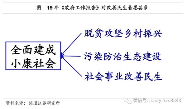 小康社会关键年,脱贫治污保民生。19年是全面建成小康社会的关键之年,政府工作报告对改善民生同样着墨甚多,总结来看主要有三个方面。一是推进脱贫攻坚和乡村振兴,包括打好精准脱贫攻坚战、抓好粮食生产、推进乡村建设、全面深化农村改革。二是加强污染防治和生态建设,包括持续推进污染防治、壮大绿色环保产业、加态系统保护修复。三是加快发展社会事业,包括提升教育公平和质量、保障基本医疗卫生服务、完善社会保障制度等。整体来看,今年报告更重视增强人民群众获得感、幸福感、安全感。