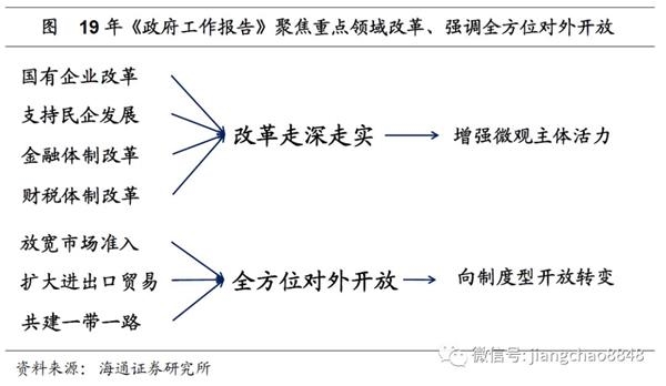 总结而言,19年改革将更聚焦重点领域,深耕国企改革、支持民企、财税改革、金融改革,旨在释放市场活力和社会创造力。而19年对外开放将升级至全方位,更加注重规则等制度型开放,以开放带动改革。