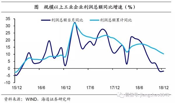 企业税收占比偏高,盈利状况不容乐观。而我国企业部门纳税占比合计超过80%,明显偏高,主要发达国家中,美国、加拿大、英国、德国的企业税收占比仅为34%、42%、50%和52%。经济回落叠加税收等各项成本刚性,使得企业盈利状况同样不容乐观,18年规模以上工业企业利润总额增速10.3%,较17年显著下滑,其中12月利润总额同比增速继续下滑至-1.9%,创16年以来新低。