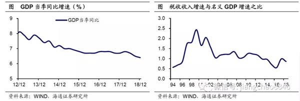 经济下行承压,税收负担高位。18年经济下行压力加大,GDP增速前高后低,4季度已降至6.4%,创下09年2季度以来的历史新低。从税收增速与名义GDP增速之比来衡量,17年税收负担有比较明显的上升,16年1%的名义经济增长只带来税收增长0.55%,而17年这一数值大幅攀升至0.99%,18年虽然受到减税政策影响有所回落,但仍在0.86%,远高于15年和16年的水平。