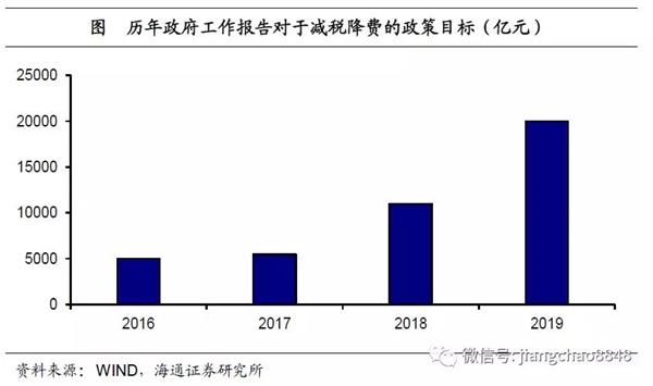 增值税率再降,减税约八千亿。18年经济下行压力加大,而税收负担也处于高位,其中企业部门纳税占比偏高。过去靠举债来刺激经济增长的财政政策受限于债务规模,减税成为本轮积极财政政策的主线。增值税征收自流转环节,是我国的第一大税种,此次减税从增值税入手,一方面,体现了普惠性减税的政策思路,另一方面,也展现了政府让利于民的决心与诚意。总理在19年政府工作报告中指出,将制造业等行业增值税率从16%进一步降至13%,下调3个百分点,交通运输、建筑业等行业增值税税率从10%降至9%,下调1个百分点,而部分服务行业6%一档的税率保持不变。根据我们的测算,本次税率下调带来的增值税减税幅度约在12.6%,假设旧税率下19年增值税收入增长速度较18年减半,则税率下调带来的减税规模超过8100亿元,占18年的比重约在0.9%。