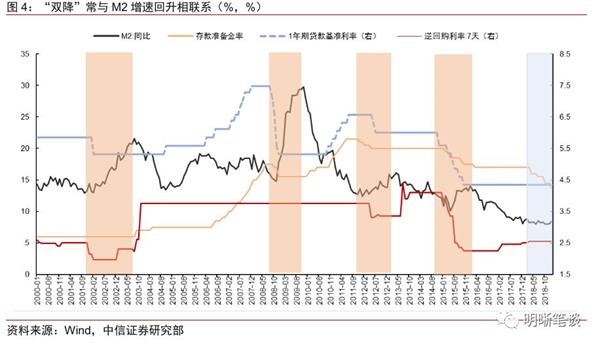 要求M2和社融规模增速要求与民义增速相匹配,降准在预期之内。按历史上多数时期的情况,则M2增速至少要回升到名义GDP增速的水平(2018年全年GDP现值同比平均为9.7%,实际GDP+GDP平减指数2018年均值为9.8%),而2019年1月M2增速仅为8.4%,存在1.3pcts~1.4pcts的差距。退一步讲,即便“匹配”是要求M2增速和社融增速与民义GDP增速保持在较小的差距内(1pcts),也意味着M2增速将会在宽松货币政策下回升。而2000年以来历次M2增速回升的阶段,除2005~2006年外,其余阶段均与“双降”相联系。