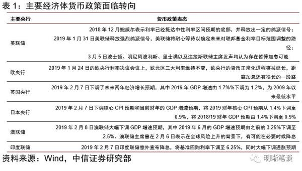 全球流动性拐点是支撑股债双牛的基础。2018年12月美联储议息会议上,美联储主席表示美国利率水平已经达到中性利率区间预期的底部,释放出鸽派信号;在1月底的FOMC会议上,美联储再次释放出强烈各派信号;3月5日四位地区联储主席发声认为存在暂停加息可能。除美联储外,欧央行、英国央行、日本央行、澳联储均下调经济增长预期、释放货币政策鸽派信号。此外印度联储在2月7日意外宣布降息。2019年全球主要经济体货币政策都面临转向,流动性的拐点或在不远处。