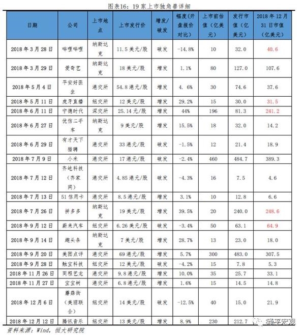 中国独角兽上市频繁,香港和美国是主要选择地。据统计,2018年全年,中国共19家独角兽实现上市,上市前估值从10亿美元到460亿美元不等,上市地点包括港交所、纽交所、纳斯达克和深交所,数量分别为8家、5家、5家、1家,总数达历史新高。尽管如此,已上市独角兽真的万事无忧了吗?对比上市前后数据来看,现实并非如此。
