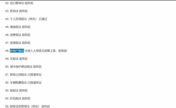 其中在2018年,在新华社受权发布的十三届全国人大常委会立法规划(共116件)中,房地产税已被列入到第一类项目,即条件比较成熟、任期内拟提请审议的法律草案(69件)中。