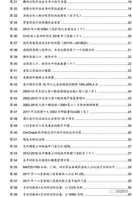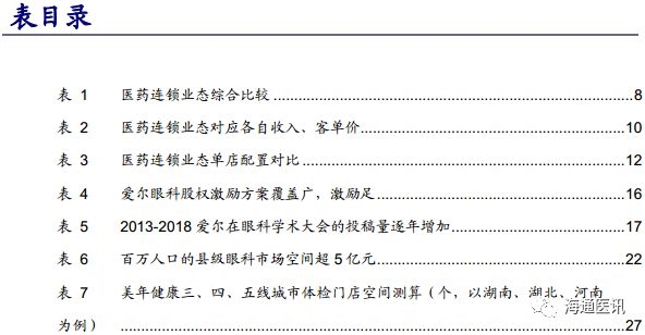 医药连锁业态一共涉及7家公司,分别是、、、、、、。自7家公司上市以来,海通医药团队对他们均进行了密切跟踪,时间跨度近10年,也积累了许多心得和问题。比如,爱尔眼科已经实现了市值9年9倍的高成长,未来的空间在哪里?同样是做口腔连锁,为什么通策医疗能盈利,而拜博口腔、佳美口腔等都难以扭亏为盈?美年健康经历广州事件之后,破局之路怎么走?零售药店行业挣的是“辛苦钱”,企业的核心竞争力究竟是什么,如何面对外来资本、医药电商的竞争?等等。