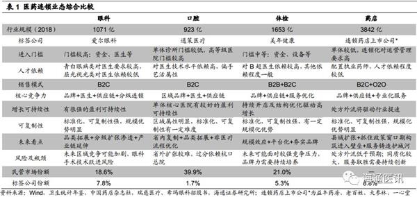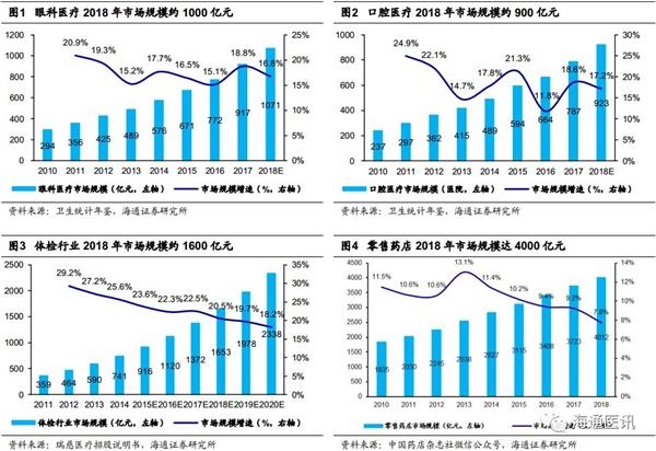 医药连锁各子业态均具备千亿级别规模。根据2018年卫生统计年鉴数据测算,2018年国内眼科医疗服务市场规模和口腔医疗服务市场规模均在一千亿元左右,2018年增速为17%左右。据招股书,国内体检市场规模2018年约1600亿元,其中民营体检份额占21%,2018年增速为18%。据中国药店杂志社数据,零售药店2018年市场规模近4000亿元,2018年增速近8%。