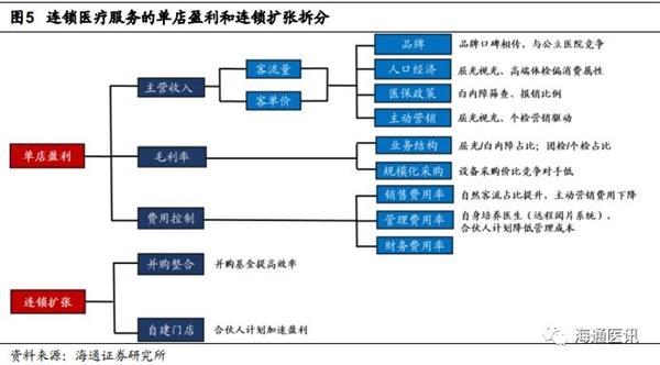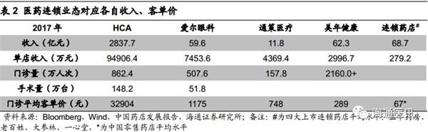 单店盈利由门店业态决定。门店业态对应各自客单价和毛利率,从而构成单店收入和盈利,单店增长亦取决于后续的品类拓展。美国综合医疗集团HCA的门诊客单价为3.3万元人民币,单店收入为9.5亿元;爱尔眼科2017年的门诊平均客单价为1175元,屈光视光业务的毛利率高于50%,单店收入超7000万元;通策医疗和美年健康的门诊客单价为百元级别,其医疗服务、体检业务毛利率为40%-45%,单店收入在3000万-4000万元左右;连锁药店的平均客单价为70元,各品类毛利率为30%-50%不等,单店收入近300万元。