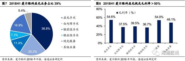2.3.1 爱尔眼科——县级医院、品类拓展县级医院和品类拓展是爱尔眼科下一阶段的重要驱动力。截至2018年底,爱尔眼科的医院已进驻190个地级市(天眼查数据,仅注册),我们认为县级医院是下一个蓝海市场,根据我们测算109家县级医院+456家门诊部的布局将再造一个爱尔眼科。另一方面,老花三焦晶体、角膜塑形镜等品类拓展将拉动单店营收增速,未来将受益于需求端的支付能力提升,以及供给端的产业链延伸。最后,随着爱尔眼科规模的扩大,公司也具备控制供应链的条件和需求,而这也将展现显著的规模效应。