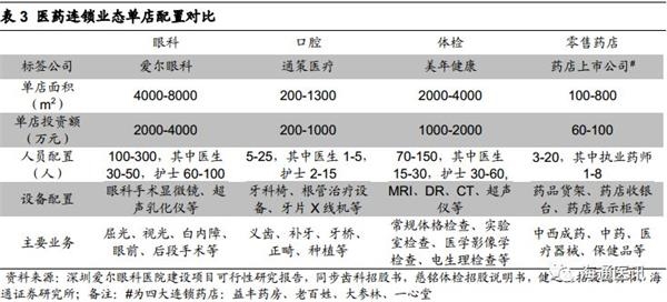 总体而言,单店配置上零售药店<口腔诊所<体检中心<眼科医院。1)在营业面积和投资额方面,从药店、口腔、体检到眼科业态呈依次递增趋势。2)医疗属性方面,药店<体检<口腔≈眼科,对应医药人员、设备配置递增,药店的药事服务能力更多起到轻问诊功能;体检中心目前阶段更倾向于疾病的检出服务,医疗环节更多在综合医院完成;口腔与眼科的医疗属性呈结构化分布,常规的洗牙美白和屈光手术偏消费属性,而口腔修复和眼病类则偏医疗属性。