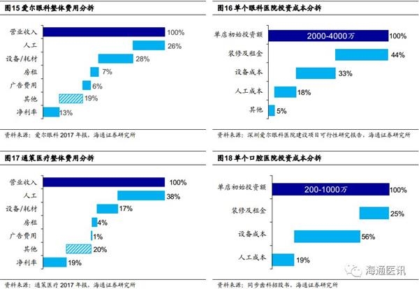 2)装修及租金成本占比眼科最高,药店次之,口腔最低。因眼科医院因对营业场所改造要求较高,故该项成本占比最高;药店因门店面积小及基数原因,装修及租金占比高;口腔的租金成本低由其区域化和中心化属性决定。