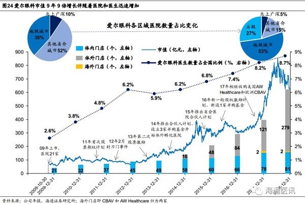2.2.1 爱尔眼科市值缘何9年增长9倍?尽管眼科医院的初始投入相对较高,行业依旧有众多竞争者:普瑞眼科、华厦眼科、新视界等,而爱尔眼科缘何实现了9年9倍的增长,从2009年刚上市21家眼科医院成长为全球最大的连锁眼科医疗机构?我们认为公司的核心竞争力体现在分级连锁模式塑造品牌、完善的人才培养体系和激励充分的机制,公司上市以来高速成长的9年,也是医院个数和医生数量迅速提升的过程。