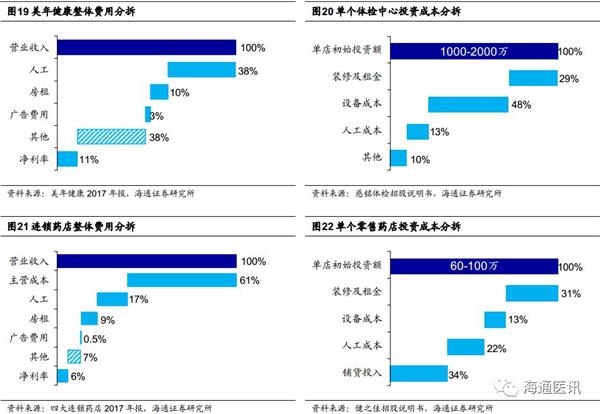 成本分布上各有轻重。我们将标签公司及单个门店的成本进行分拆,发现:1)人力成本占比口腔最高。口腔医院因对医生个人依赖度更高,表现为高人工占比,其他业态的人工占比相对较低;异常值中美年健康的人工成本占比较高因2017年在职员工较多,单个药店的人工成本占比高主要因成本基数小。