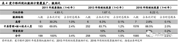 股权激励计划覆盖广,激励足。公司分别于2011年、2013年、2016年实施了三次股权激励计划,覆盖公司、核心管理和技术人员合计超2000人次,股票份额分别占当时总股本的3.4%、1.5%、2.2%。前复权后,三次股权激励的价格分别为4.93元/股、1.67元/股和6.22元/股,相较公司目前股价激励充分。
