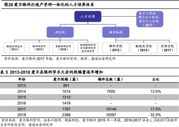 爱尔眼科在人才上的另一突出优势是完善专业的培养体系。疑难眼病类相比屈光视光类业务更依赖专业医生,而医生除了薪酬激励外,更看重职业上升通道、科研教学实力、学术交流平台等,爱尔眼科打造了头部拔尖、基础扎实的人才培养体系,国际化及科教研水平高,某些方面媲美甚至超越顶级公立医院,显著增强了对医生的吸引力。公司依托两站(院士专家工作站、博士后科研流动站协作研究中心)、三院(中南大学爱尔眼科学院、湖北科技学院爱尔眼视光学院、爱尔管理学院)、六所(眼视光研究所、眼科研究所、角膜病研究所、视网膜研究所、青光眼研究所、屈光研究所)的科研学术平台,全面推动‘产、学、研’一体化的布局,并凭借CBAV、AW Healthcare等旗下医院增强国际化影响力。公司学术成果丰硕,2018年全国眼科大会,爱尔眼科论文数量占比23%(2388/ 10597)。