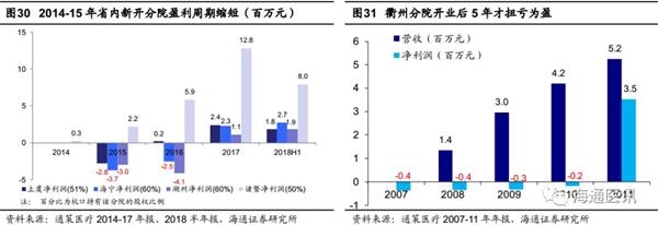 回归“总院+分院”模式强化区域品牌,通策医疗第二轮扩张快速盈利。2013年起通策医疗从省外大幅扩张开始回归“区域总院+分院”模式,依托杭口中心旗舰医院的当地品牌,公司在浙江省内的杭州、宁波、诸暨、衢州、义乌、舟山、宁海等地陆续开设多家分院,省内诊所依托杭口品牌快速盈利,稳定扩张。强基站+卫星布点共建区域品牌,2014年起通策医疗在浙江省内新开医院的盈利速度明显加快:2014-15年省内新开的诸暨、海宁、上虞、湖州均在1-2年内达到盈亏平衡,2018H1收入端诸暨分院同比增长都超38%、海宁分院同比增长39%、上虞分院同比增长47%、湖州分院同比增长43%。与2007年设立的衢州医院四年达到盈亏平衡相比,区域分院盈利速度明显提升。