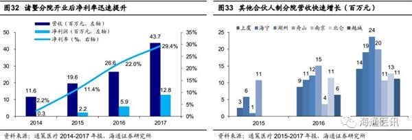 合伙人制绑定核心员工,区域分院收入快速爬坡。公司通过设立员工基金参与投资新建医院项目,将核心员工的利益与分院发展绑定,充分激发员工积极性。公司2013年报披露,由全资子公司通胜医疗与42名员工共同设立杭州赢湖创造、杭州嬴湖共享,参与对分院的投资。自2013年12月设立诸暨口腔医院起,公司后续设立的医院基本都有赢湖创造、赢湖共享参与投资,包括诸暨、海宁、舟山、上虞、越城、湖州、嵊新、南京、北仑、萧山等分院。另外部分新建医院还向核心管理团队和技术人员开放投资认购,如宁口部分核心员工出资20%参股舟山分院,城西部分核心员工出资20%参股湖州分院,从而实现重要员工合伙人制,绑定医院核心人才,增强区域医院合作,极大提高了分院盈利增速。诸暨分院设立1年之内即实现盈亏平衡,2015年以后开设的其他合伙人制分院也表现出更高的营收增速(平均营收增速2016年高达391%,17年高达78%),与公司原有医院相比,实行合伙人制的新建分院营收增速高、实现盈亏平衡的速度快,体现出显著优势。