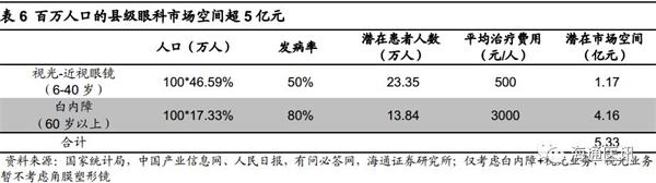 县级医院,品牌建设的下一个蓝海市场。爱尔眼科目前基本在地级市完成了布局,而县级医院正处于开发初期。我们预计县级医院、门诊部可以自行消化白内障+视光业务,其他业务如屈光、眼病等可向上级医院转诊。经过我们测算,百万人口的县级城市的眼科医疗市场收入容量超5亿元。县级医院作为分级连锁体系中的基层眼科中心,是爱尔眼科品牌下沉的蓝海市场。