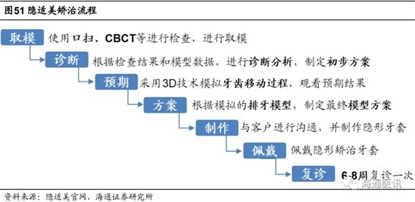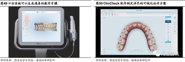 数字化正畸则以AlignTechnology公司的隐适美(Invisalign)为例。隐适美3D可视化方案最快可在48小时之内看到,大大缩短工序时间。iTero口内扫描仪器几分钟即可完成全口腔数字化扫描,精准获取牙齿的数据,且扫描后即可获得ClinCheck方案,可初步看到矫正效果,并制定详尽的治疗方案(具体到最微小的移动),从第一副矫治器开始,直到矫治结束,全程可视化操作,降低操作难度。