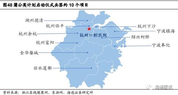 通策医疗“蒲公英计划”类似加强版的DSO,成功培养将强化公司竞争力。公司与杭州口腔医院集团联合发起“蒲公英计划”:由杭口集团在浙江省内的各县市区,联合各地有威望的优秀口腔医生,投资建设杭口口腔医院分院,其中杭口集团提供品牌、人才、管理、财务等支持。“蒲公英计划”规划未来3-5年在浙江省内建设100家分院,主要覆盖浙江省内的县(市、区)及重点乡镇。与美国大部分DSO保留自身品牌相比,我们认为“蒲公英计划”有望打造为加强版的DSO,除了非医疗过程集约化管理,更在医疗过程大大调动医生的积极性,降低人工成本,缩短分院培育期。2018年12月蒲公英启动仪式已有10家分院签约,我们认为该模式的成功培养,将大幅提高分院的可复制性,增强通策医疗的核心竞争力。