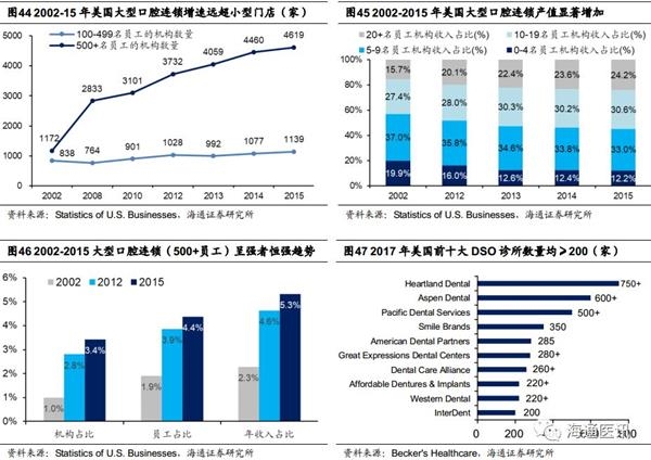 2002-2015年美国口腔市场集中度持续提升。期间大型口腔连锁的企业数量增速远超小型口腔诊所门店,雇员人数>500人的大型口腔连锁企业数量从2002年的1172家增长至2015年的4619家,增速高至294%,同期雇员人数500人的大型口腔连锁企业的机构占比、员工占比、年收入占比均持续提升,呈现强者恒强趋势。