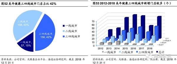 渠道下沉是品牌建设的另一路径。三、四线城市体检覆盖率低,缺乏优质医疗资源,是体检行业蓝海市场。目前民营体检机构在三、四线城市仍布局较少,竞争相对较小;另外相比一、二线城市,三、四线城市人力费用和房屋租金等成本费用较低,具备快速盈利的潜力。截至2018年12月,公司营业门店中一线城市门店占15%,二线城市门店占43%,三、四城市门店合计占42%。从2014开始,美年健康(含)加速布局三、四城市门店,三、四线新设门店数量高于一、二线城市,2018年已经渗透至部分五线城市。