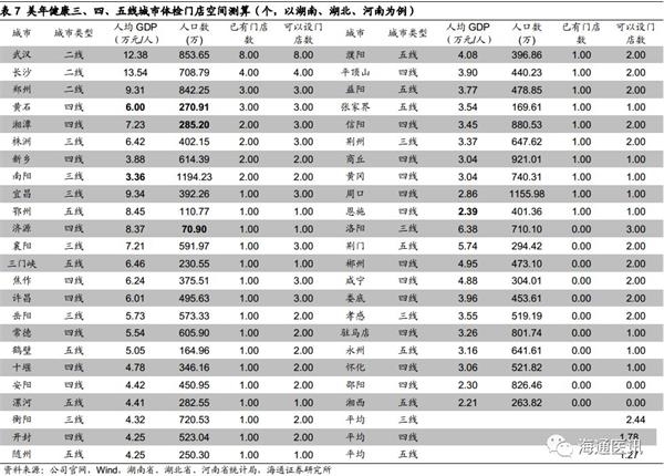 美年健康在三线及以下城市具备近三百家体检中心增量。目前公司在湖南、湖北、河南三省的门店已涉及三线、四线、五线城市以及省辖县级市。根据已有门店数量与所在城市的人口数和人均GDP,我们测算大部分城市都可以开设至少一家店,而人口多、人均GDP 高的城市可以开设2-3家门店。以湖南、湖北、河南三省为例,我们认为三线、四线城市可开设门店2家以上,五线城市可开设门店1家以上(保守估计)。根据《第一财经周刊》旗下新一线城市研究所分类,中国大陆一共有三线城市70个、四线城市90个、五线城市129个,预计在全国的三线及以下城市可以开设门店(70×2+90×2+129×1)=449家。而目前仅有156家,按照现有消费水平估计,三线及以下城市至少还可以新开293家门店,渠道下沉空间巨大。