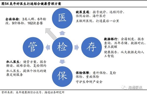 美年健康的另一方向是服务体系医疗化,甚至形成医疗闭环。健康体检本身医疗属性较弱,医疗化有助于增强用户黏性。公司此前嵌入优健康、美因基因等服务,为客户提供更个性化的体检方案;并与(HPV疫苗)、美维口腔等开展合作,提供更完备的后端服务。2018年10月,公司推出“美年好医生”,从单一体检迈向“检、存、管、医、保”综合健康管理。美年好医生为不同客户提供高品质的体检服务,并充分利用合作伙伴的优势:通过优健康APP储存分析消费者历年的体检报告;依托等专业人员深度解读体检报告;凭借大象医生实现远程医疗,并提供就医咨询、预约、住院等绿色通道服务;与财险联手,定制3款保险实现保障全覆盖。“检”“存”“管”“医”“保”五大环节深度分析并满足消费者对于健康管理的核心需求。医疗化的探索和完善,将成为美年健康最重要的核心竞争力之一。