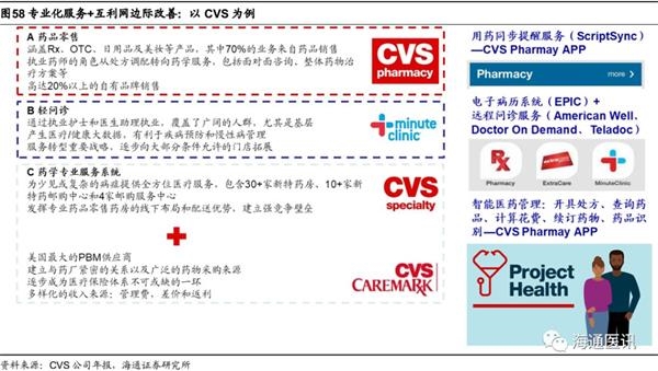 专业化+互联网边际改善的服务构筑更强的壁垒。参考美国连锁药店龙头公司CVS和WBA,均发展了较成熟的专业化服务能力,包括远程监护、慢病管理、疾病查询等。并利用互联网和信息系统,对非服务流程进行边际改善(智能医药管理),从而降低成本,提高服务效率。药品是标准化的,但买药之前的服务是高度非标的,天生具备“轻问诊”需求。在目前高水平的远程诊疗建设成本远高于线下医师、药师人力成本的背景下,连锁药店龙头的专业化服务受互联网冲击较小,药店分类分级政策的推行也将提高龙头服务水平,继续加大与医药电商的差距。我们认为线下线上融合是药店业态的发展趋势,无论是目前的O2O模式,还是未来可能演绎的PBM+邮购药房模式,构筑专业化的服务体系并利用互联网边际改善将是连锁药店龙头的长期优势。