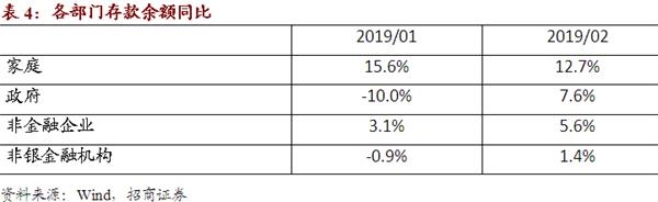 分部门来看,2月底家庭存款余额同比增长12.7%,前值15.6%;2月底非金融企业(不含机关团体)存款余额同比增长5.6%,前值3.1%;2月底政府存款余额同比增长7.6%,前值同比下降10.0%。2月底非银金融机构存款余额同比增长1.4%,前值同比下降1.4%。