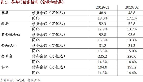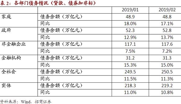 从结构上看,2月非金融企业贷款加债券余额同比增速与前值持平;如果加入信托贷款、委托贷款和未贴现票据三项非标融资,则有所回落,主要受未贴现票据拖累。2月家庭部门债务余额同比增速较前值出现较大幅度下滑,与我们之前的预期一致,我们仍然判断家庭部门去杠杆方向未变,对应房地产数据表现难言乐观。政府部门债务余额同比增速连续3个月(12月、1月、2月)出现较大幅度上升,考虑到目前的情况和数据,3月政府部门债务余额同比增速将有所回落,但应高于1月的水平。我们维持之前的观点,目前基本可以判断,财政政策的底部已经在2018年11月份出现。金融机构方面,目前我们能观察到的金融机构债务约为30万亿,占广义金融机构债务规模的近三成,因此其代表性较差,根据现有数据,我们倾向于判断2月广义金融机构债务余额同比增速或低于前值。