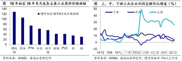 去产能令价格上涨,上游国企受益最大。去产能令供给大幅收缩,因而带来工业品价格大幅上涨,再叠加地产去库存对终端需求的拉动,过去两年工业企业收入、利润增速均大幅上升。但新增利润主要集中在中上游行业,18年钢铁、建材、化工、煤炭、油气开采等五大行业对利润增长的贡献率合计达到74%。然而,上游行业中,由于民企大量关停,国企成为了利润高增长的主要受益者。而在民企占比较高的中下游行业,却面临成本大幅上升、侵蚀盈利的困境。