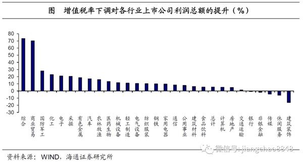 假设增值税减税效果均作用在企业部门,则根据上市公司17年年报数据测算,整体来看,本次增值税率下调对上市公司利润增厚幅度约在5.4%左右,而中位数水平约在10%,其中商贸、国防军工、化工和电子行业受益明显,装备制造行业也大都处于中位数水平以上,而地产和金融板块获利有限。
