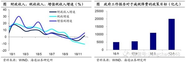 我们看到,在18年,我们已经实施了增值税税率下调1%,个人所得税减免等多项政策,4季度的增速明显下降,税收收入增速转负。而今年《政府工作报告》提出,要实施更大规模的减税降费,全年减轻企业税收和社保缴费负担近2万亿。其中,制造业增值税率从16%降至13%,交通运输、建筑业增值税率从10%降至9%。此外,降低企业社保缴费负担,下调城镇职工基本养老保险单位缴费比例,各地可降至16%。