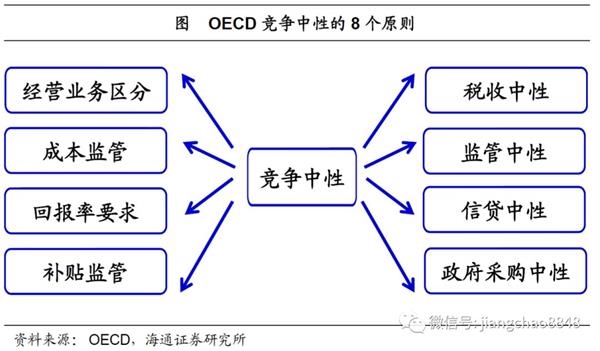 去年10月,央行行长易纲在18年G30国际银行业研讨会的发言中提及以“竞争中性”原则对待国有企业。在我们看来,这不仅涉及中资与外资企业,也涉及国有企业与民营企业。竞争中性的概念经由OECD等国际组织的推广逐渐成为发达国家所倡导的国际标准。OECD对竞争中性设定了8大原则,达成竞争中性环境需要对政府企业进行经营范围划分,区分公共服务义务的非竞争性业务与具有竞争性的正常商业活动。同时,需要在税收、监管、信贷便利和公共采购方面对所有企业一视同仁,并特别对国企的成本、投资回报率和所接受的政府补贴进行透明监管。