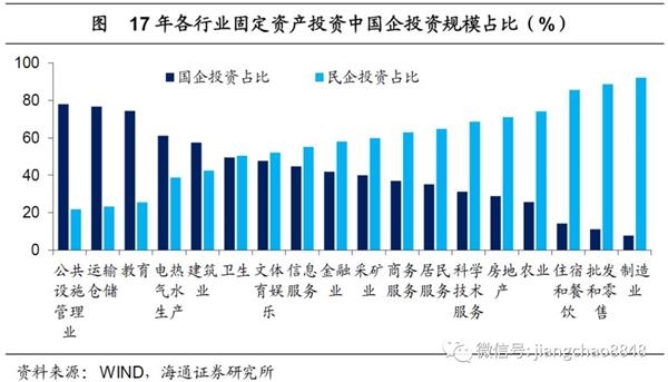 由于民企规模普遍低于国企,民企和国企在投资规模上的差异要远胜于数量上的差异。18年统计局不再公布分行业民间投资数据,而从17年固定资产投资数据看,除去水利和公共设施管理、电热气水生产供应和交运仓储等传统基建行业以外,教育、建筑业等行业的国有资本投资也都普遍高于民企投资,而卫生、文体娱乐、信息服务业则基本持平。