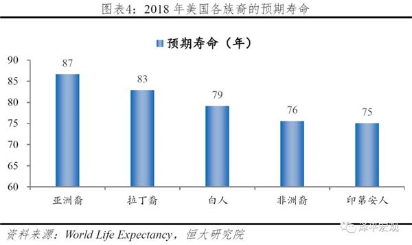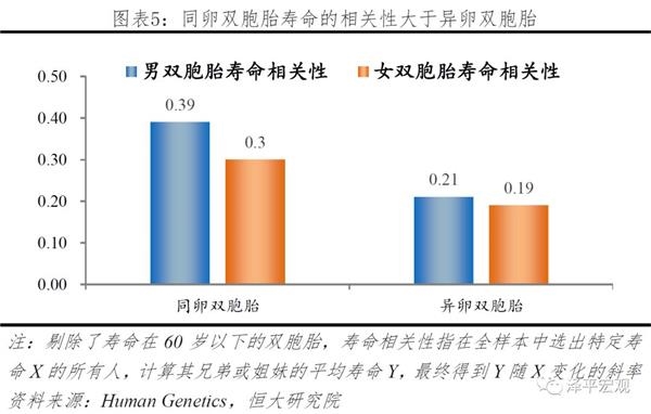 遗传差异包括性别差异、种族差异和个体差异,三者均对寿命有较大影响。种族差异方面,美国各个族裔的寿命差异最大达到了12年,其中亚裔人最为长寿,说明了黄种人基因在寿命方面的优势;性别差异方面,各个国家女性预期寿命均比男性长,全球平均长4.4年;个体差异方面,同卵双胞胎之间的寿命相关性大于异卵双胞胎,基因差异对于个体寿命的影响毋庸置疑,拥有长寿基因的个体更有可能长寿。
