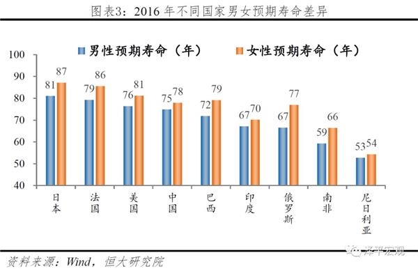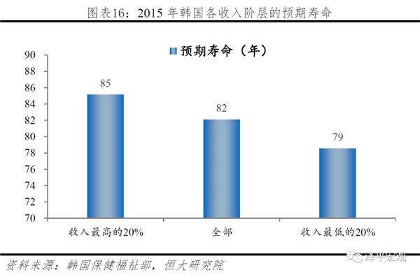 从实证角度出发,经济收入对健康寿命的影响也能得到进一步的验证。例如冲绳、撒丁岛等世界公认的长寿之乡均位于高收入国家;同为黑种人,由于美国黑人的人均收入高出非洲国家5倍以上,其预期寿命也高出10年以上;俄罗斯在上世纪90年代苏联解体后经济倒退、失业率攀升,其男性预期寿命也急剧下滑。个人经济收入方面,韩国收入最高与最低20%的人群预期寿命相差6年。