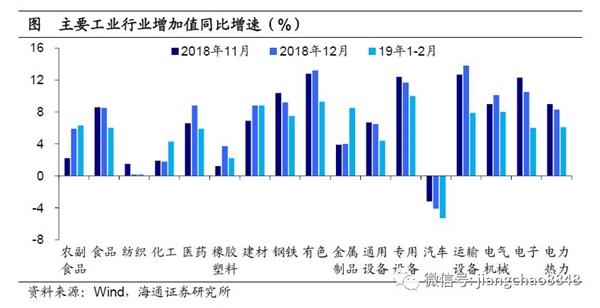 从微观看,各主要产品产量增速涨跌互现。1-2月发电量增速较18年12月明显回落,各主要工业产品产量涨跌互现,其中:上游原油加工量回升,煤炭产量下滑转负;中游钢铁、化纤、乙烯上升,有色、水泥回落;下游汽车降幅收窄。因而,从微观看,钢铁、有色贡献较大,而煤炭、乙烯、水泥、汽车是主要拖累。
