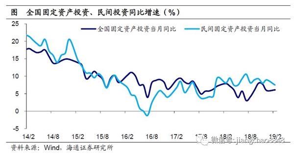 固定资产投资增速微幅反弹。19年1-2月全国固定资产投资同比增速6.1%,较18年12月微幅反弹,主要缘于口径调整,由累计值计算得到的同比增速仅为0.5%。而1-2月民间投资增速仅为7.5%,较18年12月明显下滑,指向投资内生动力不足。