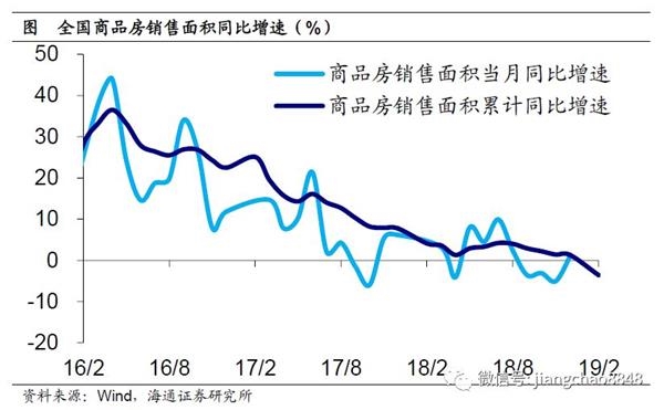 地产销量增速再度下滑转负。19年1-2月全国商品房销售面积同比增速-3.6%,其中住宅商品房销售面积同比增速-3.2%,均较18年12月再度下滑转负。而1-2月全国商品房待售面积同比增速-10.6%,降幅继续收窄。