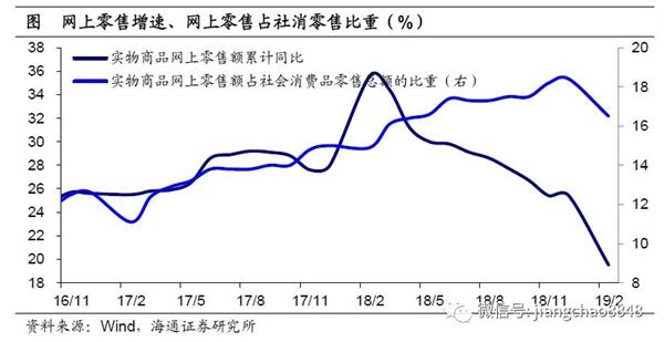 网上零售增速继续下滑,占比小幅回落。1-2月实物商品网上零售同比增速继续回落至19.5%,仍处高位,也远高于社消零售增速。而由于1-2月剔除实物商品网上零售后的社消零售增速为6.2%,较18年有所回升,因此实物商品网上零售占社消零售比重回落至16.5%。